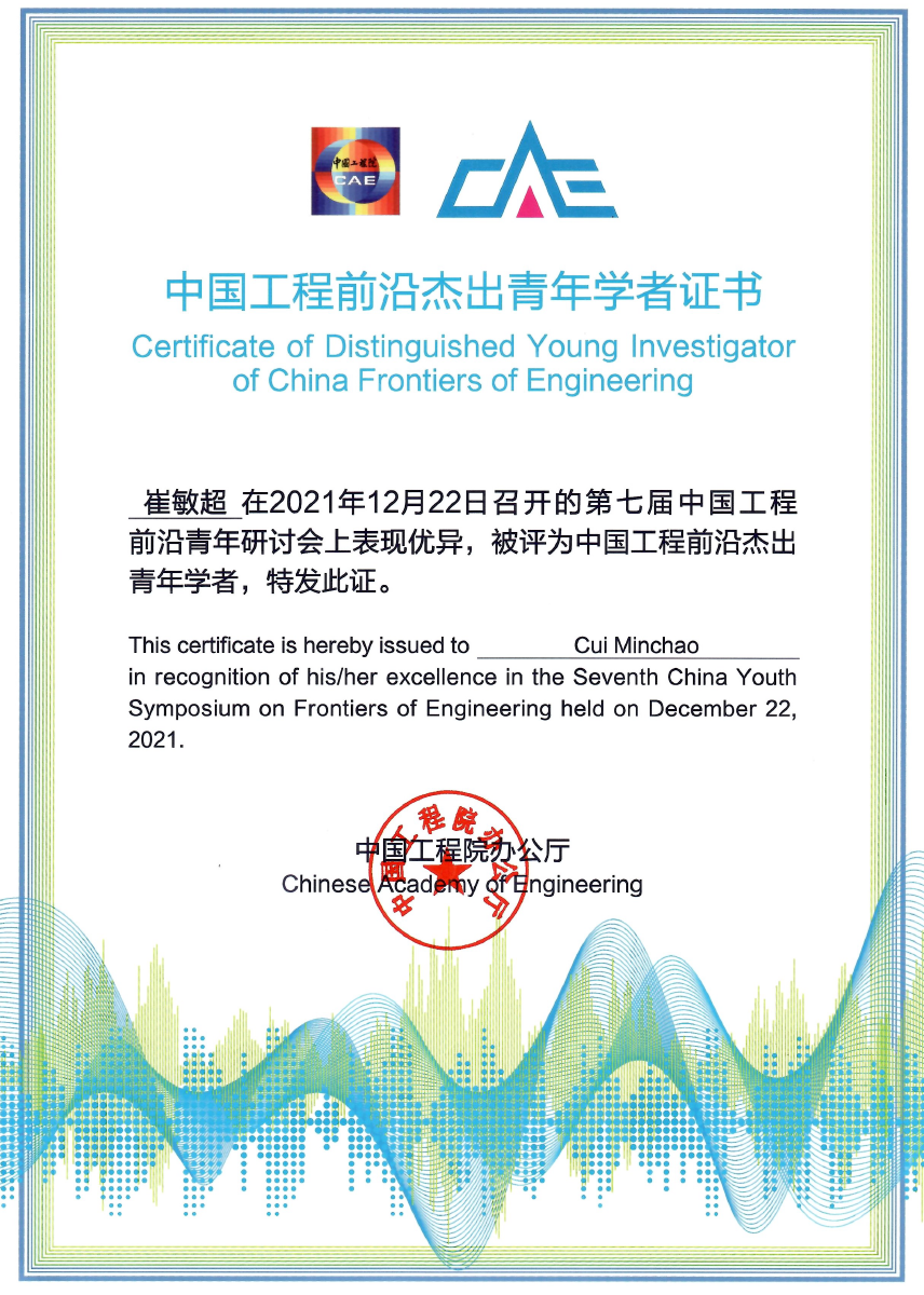 2022年7月19日-21日,“第七届中美工程前沿研讨会(简称CAFOE)”以视频会议方式在北京和美国加州尔湾举行。best365网页版登录官方网站青年教师崔敏超受邀参加研讨会并荣获由中国工程院颁发的“中国工程前沿杰出青年学者”荣誉证书。
