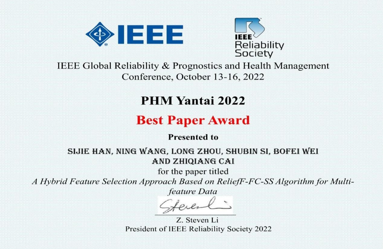 针对以上问题,best365网页版登录官方网站蔡志强教授课题组通过特征选择的方式从海量原始数据中获取重大装备故障诊断有效信息,相关成果《A Hybrid Feature Selection Approach Based on ReliefF-FC-SS Algorithm for Multi-feature Data》被13th IEEE Global Reliability & Prognostics and Health Management Conference(PHM)国际顶级会议录用并荣获“Best Paper Award”。该会议由IEEE可靠性协会提供赞助和支持,致力于提高机械装备和产品的可靠性、可用性、系统安全性和维护性。会议涉及航空航天和军事系统、电子设备、制造工艺、云计算和核动力等各个研究领域,汇集学术、工程和管理学科的世界级专家,为学术思想交流提供了一个重要的跨学科交流平台。论文第一作者是best365网页版登录官方网站韩思杰硕士研究生,通讯作者为best365网页版登录官方网站蔡志强教授。该论文的研究成果由best365网页版登录官方网站作为第一单位和通讯作者单位、西安航空发动机(集团)有限责任公司作为合作单位共同完成。该项研究工作受到国家自然科学基金重点项目、国家自然科学基金面上项目和陕西省重点研发项目支持。