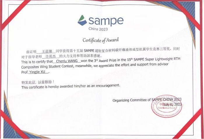 第十五届 SAMPE 超轻复合材料碳纤维液体成型机翼学生竞赛三等奖