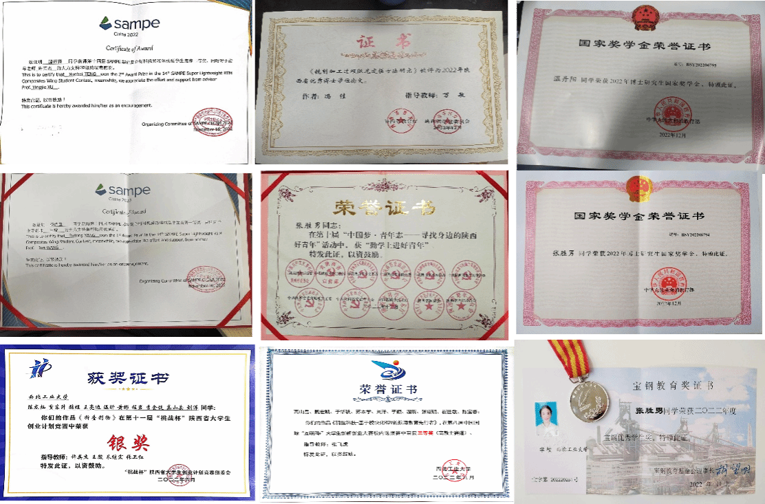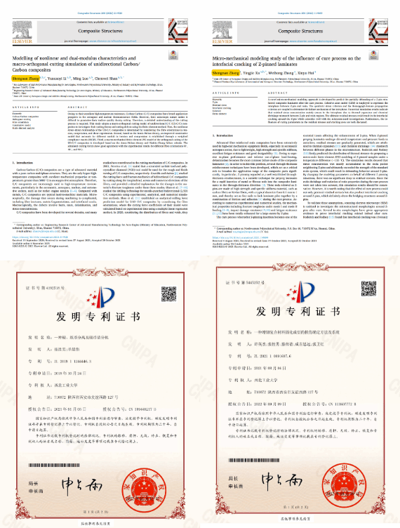 牢记使命,逐梦科研:主持研究生种子基金2项,作为核心成员参研国家级重大课题5项等;博士期间累计发表高水平学术论文11篇,其中以第一作者在中科院一区发表顶刊6篇,本学年2篇,以第一作者申请国家发明专利5项,本学年公开1项,授权2项; 参编Elsevier英文专著1部;本学年参加高水平学术会议1次。研究成果被列为第五轮学科评估学生标志性成果,有力地支撑了学科建设。同时,成果得到了中国科学院院士张卫红、中国工程院院士杜善义等权威专家的认可和引用。英国皇家工程院院士Kinloch和澳大利亚技术与工程学院院士Wang在合著的论文中,评价候选人建立的模型能够更精确的(more accurate)地计算固化成型过程中形成的残余应力,并采用申请人提出的模型参数计算复材界面损伤。创新理论成果助力团队荣获2023年中国航空学会技术发明一等奖。