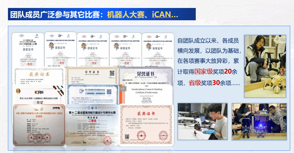 团队成员在机器人大赛,iCAN等赛事国家级奖项20余项,省级奖项30余项;