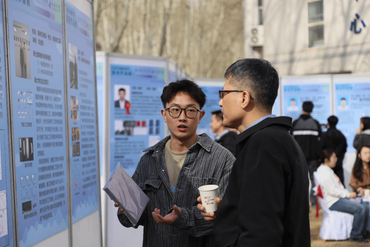 在众多优秀的毕业成果中,航空宇航制造工程专业毕业生孙文博的作品格外引人关注。他针对TC4钛合金表面耐磨损性能差的问题,开展了表面纳米化以及离子渗氮复合表面处理研究,极大提升了TC4钛合金的耐磨性能,为TC4钛合金表面强化提供了一种新的方法。热情的讲述吸引了各专业学生的目光,引来众多学生驻足观看、学习与探讨。