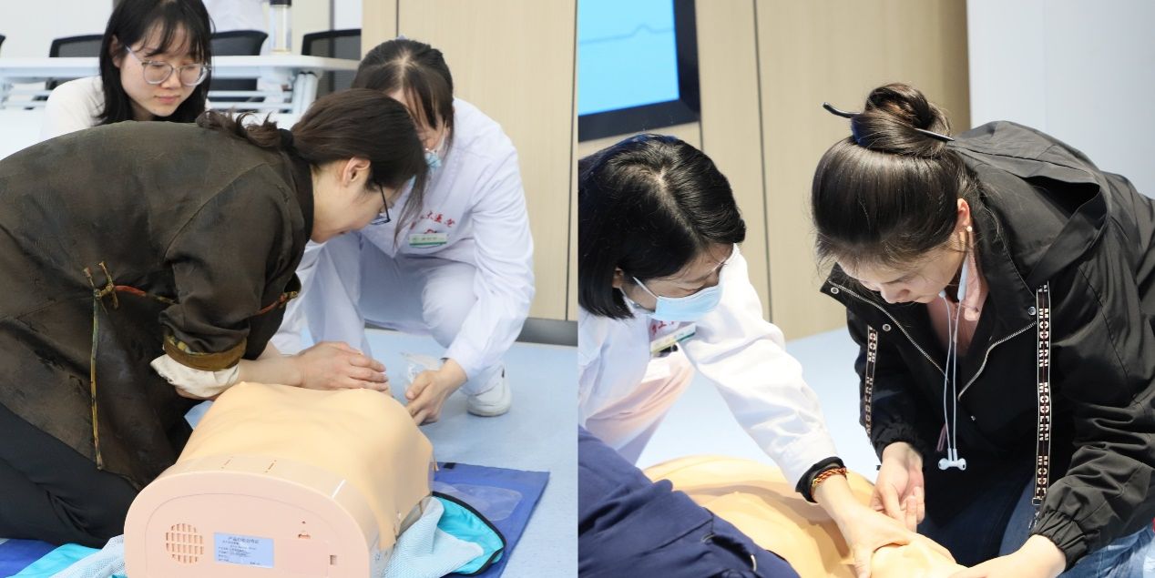 活动伊始,梁乐乐医生介绍了急救知识和急救技能的重要性,强调“黄金四分钟”对保障生命安全的关键作用。随后,医护人员详细讲解了人工呼吸和心肺复苏的操作步骤和注意事项,以及AED(自动体外除颤器)的使用方法,并通过模拟人体模型进行了现场示范。