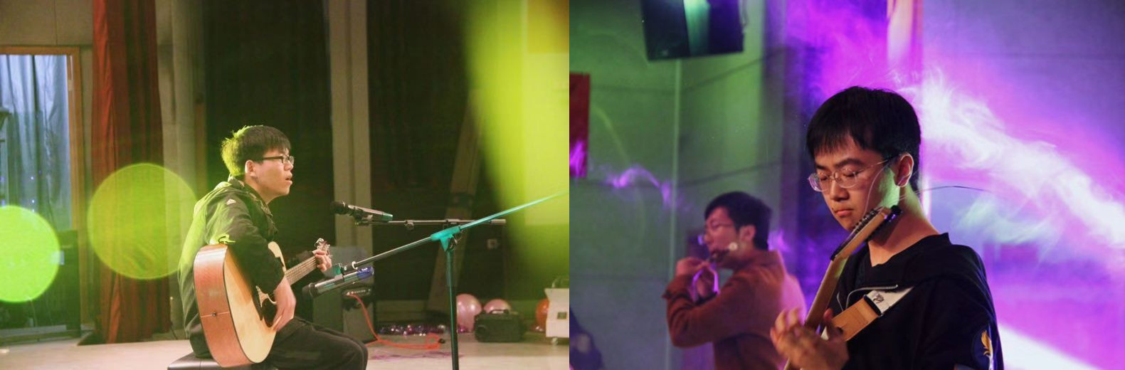 接下来胡颖石同学带来的吉他弹唱《鼓楼》,瞬间把我们带到了民谣的世界中。接下来便是两学院合作的乐器串烧节目,严进同学的吉他独奏安静细腻,让我们仿佛置身于雨后林中散步;孙立帅与武开荣同学带来的电吉他和笛子合奏曲《青鸟》把晚会又带入了一个高潮。