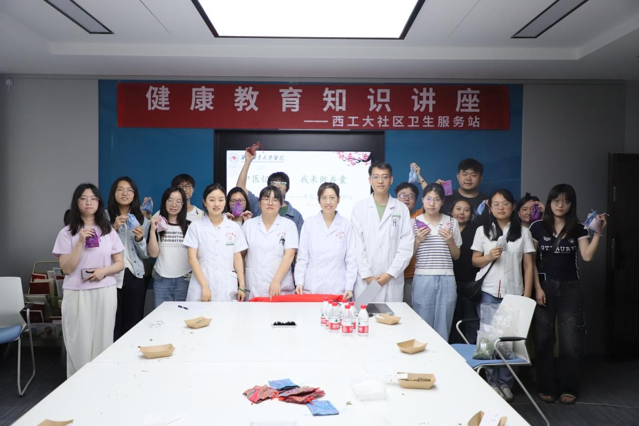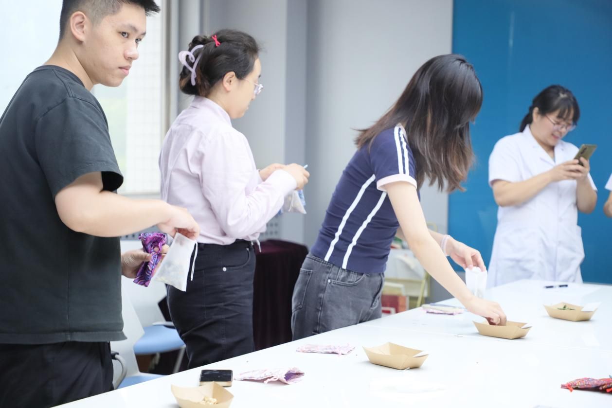 为了让理论知识更好地转化为实践体验,活动特别设置了 DIY 手工制作香囊环节。在医生们的悉心指导下,师生们亲手挑选艾叶、藿香、佩兰等中药材,按照配方比例装入精美的香囊袋中。大家相互交流制作心得,现场欢声笑语不断。随着一个个造型精美、香气四溢的香囊制作完成,师生们不仅收获了一份独特的端午礼物,更掌握了实用的自我养生方法。